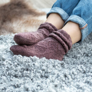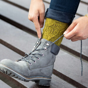Tukuwool Sock (80% Finnish wool/20% nylon; 160 meters/175 yards/50g): 2 (3, 3) skeins, shown in H23 Selja (golden heather; size small) and Ujo (pink heather; size medium). -